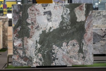 這款石材的紋路極具藝術感,以青灰為底色,深淺不一的豆綠、墨綠如游絲般肆意穿梭,間雜著乳白絮狀紋,仿佛是大自然用億萬年時光繪制的山水長卷。紋理呈現出 “波狀疊層” 的流動感,深綠與淺綠的色帶如溪流奔涌…