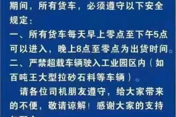 貨車(chē)通行公告各位司機(jī)朋友:由于工業(yè)園區(qū)道路維修處于養(yǎng)護(hù)期間,所有貨車(chē),必須遵守以下安全規(guī)定:一、 所有貨車(chē)每天早上零點(diǎn)至下午5點(diǎn)可以進(jìn)入,晚上8點(diǎn)至零點(diǎn)為出貨時(shí)間。二、嚴(yán)禁超載車(chē)輛駛?cè)牍I(yè)園區(qū)內(nèi)(如百…