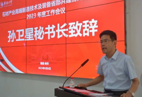 8月5日下午,石材產業高端制造技術及裝備省部共建協同創新中心(簡稱“中心”)2023年度工作會議暨石材產業研討會在南安華大石材產業技術研究院(簡稱“研究院”)會議室順利召開。中國工程院院士、中心技術委員會主任郭東明,華僑大學黨委書記徐西鵬、副校長王麗霞,南安市市長王連贊,華僑大學科技處處長李鐘慎,中國石材協會秘書長孫衛星,中心技術委員會專家、協同體單位代表和華僑大學師生共計70余人參會。會議由李鐘慎主持。
