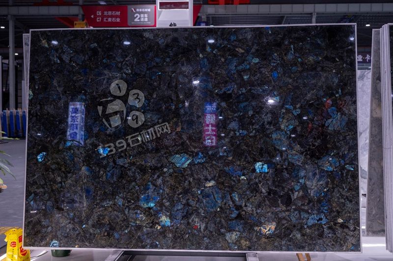 藍翡翠奢石大板的紋理極具震撼力:以深邃的黑色為基底,其上布滿大小不一、形狀不規則的藍綠色晶體碎片,這些晶體如同散落的寶石,相互交織、錯落分布,呈現出隨性卻極具藝術感的亂紋效果。晶體自帶虹彩效應,在光線照射下,會折射出從淺藍到深藍,甚至泛著紫調的斑斕光澤,仿佛將星空的深邃與寶石的璀璨濃縮于板面之上。黑色基底與藍綠色晶體的強烈對比,加之晶體的虹彩變化,讓紋理充滿了動態的奢華感,每一處細節都似天然的藝術創作,稀缺且極具視覺沖擊力。