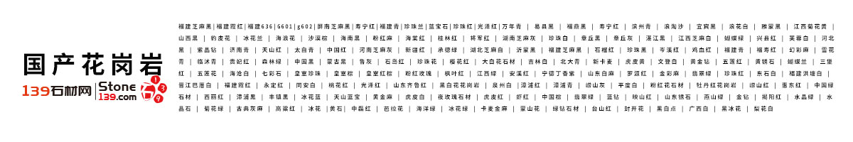國產花崗巖品種有很多,遍布全國各地,例如:鐘山青、中國紅、福鼎黑、各地的中國黑、廣西芝麻黑卡拉麥里金、楓葉紅、芝麻灰、芝麻白、福建芝麻黑,山東黃金麻,內蒙古蒙古黑石材,廣西楓葉紅,麻城芝麻白,河北森林綠,四川宜賓黑,新疆天山紅,江西新卡麥花崗巖,吉林吉林白石材等地,下文為常見的品種種類名稱以及圖片 國產花崗巖:福建芝麻黑|福建霞紅|福建636|G601|g602|屏南芝麻黑|壽寧紅|福建青|珍珠蘭|藍寶石|珍珠紅|光澤紅|萬年青 | 易縣黑 | 福鼎黑 | 壽寧紅 | 濱州青 | 浪淘沙 | 宜賓黑 | 浪花白 | 雅蒙黑 | 江西菊花黃 | 山西黑 | 豹皮花 | 冰花蘭 | 海浪花 | 沙漠棕 | 海南黑 | 粉紅麻 | 海棠紅 | 桂林紅 | 將軍紅 | 湖南芝麻灰 | 珍珠白 | 章丘黑 | 章丘灰 | 湛江黑 | 江西芝麻白 | 蝴蝶綠 | 興縣紅 | 芙蓉白 | 河北黑 | 紫晶鉆 | 濟南青 | 天山紅 | 太白青 | 中國紅 | 河南芝麻灰 | 新疆紅 | 承德綠 | 湖北芝麻白 | 沂蒙黑 | 福建芝麻黑 | 石榴紅 | 珍珠黑 | 岑溪紅 | 雞血紅 | 福建青 | 福壽紅 | 幻彩麻 | 雪花青 | 臨沭青 | 貴妃紅 | 森林綠 | 中國黑 | 蒙古黑 | 魯灰 | 石島紅 | 珍珠花 | 櫻花紅 | 大白花石材 | 吉林白 | 北大青 | 新卡麥 | 虎皮黃 | 文登白 | 黃金鉆 | 五蓮紅 | 黃銹石 | 蝴蝶蘭 | 三堡紅 | 五蓮花 | 海滄白 | 七彩石 | 皇室珍珠 | 皇室棕 | 皇室紅棕 | 粉紅玫瑰 | 楓葉紅 | 江西綠 | 安溪紅 | 寧德丁香紫 | 山東白麻 | 羅源紅 | 金彩麻 | 翡翠綠 | 珍珠紅 | 東石白 | 福建洪塘白 | 晉江巴厝白 | 福建霞紅 | 永定紅 | 同安白 | 桃花紅 | 光澤紅 | 山東齊魯紅 | 黑白花花崗巖 | 泉州白 |漳浦紅 | 漳浦青 | 嶗山灰 | 平度白 | 粉紅花石材 | 牡丹紅花崗巖 | 嶗山紅 | 惠東紅 | 中國綠石材 | 西麗紅 | 漳浦黑 | 豐鎮黑 | 冰花藍 | 天山藍寶 | 黃金麻 | 虎皮白 | 夜玫瑰石材 | 虎皮紅 | 蝦紅 | 中國棕 | 翡翠綠 | 藍鉆 | 映山紅 | 山東銹石 | 燕山綠 | 金鉆 | 揭陽紅 | 水晶綠 | 水晶石 | 菊花綠 | 古典灰麻 | 高粱紅 | 冰花 |黃石| 中磊紅 | 芭拉花 | 海洋綠 | 冰花綠 | 卡麥金麻 | 蒙山花 | 綠鉆石材 | 臺山紅 | 封開花 | 黑白點 | 廣西白 | 黑冰花 | 梨花白 萬年青 易縣黑 福鼎黑玄武巖 壽寧紅 濱州青石材 浪淘沙石材 四川黑花崗巖 浪花白 雅蒙黑 江西菊花黃 山西黑 豹皮花石材 冰花蘭 海浪花 沙漠棕 海南黑 粉紅麻 海棠紅 桂林紅 將軍紅 湖南芝麻灰 珍珠白 章丘黑 章丘灰 湛江黑 江西芝麻白 蝴蝶綠 興縣紅 芙蓉白 河北黑 紫晶鉆 濟南青 太白青 中國紅板材 河南芝麻灰 承德綠 湖北芝麻白 沂蒙黑 福建芝麻黑 岑溪紅 海洋紅 珍珠黑 雞血紅 福建青 石榴紅 福壽紅 幻彩麻 虎皮黃 雪花青石材 臨沭青石材 天山紅花崗巖 新卡麥 文登白 黃金鉆 新疆紅石材 五蓮紅 黃銹石 貴妃紅石材 森林綠 中國黑花崗巖 蝴蝶蘭石材 魯灰